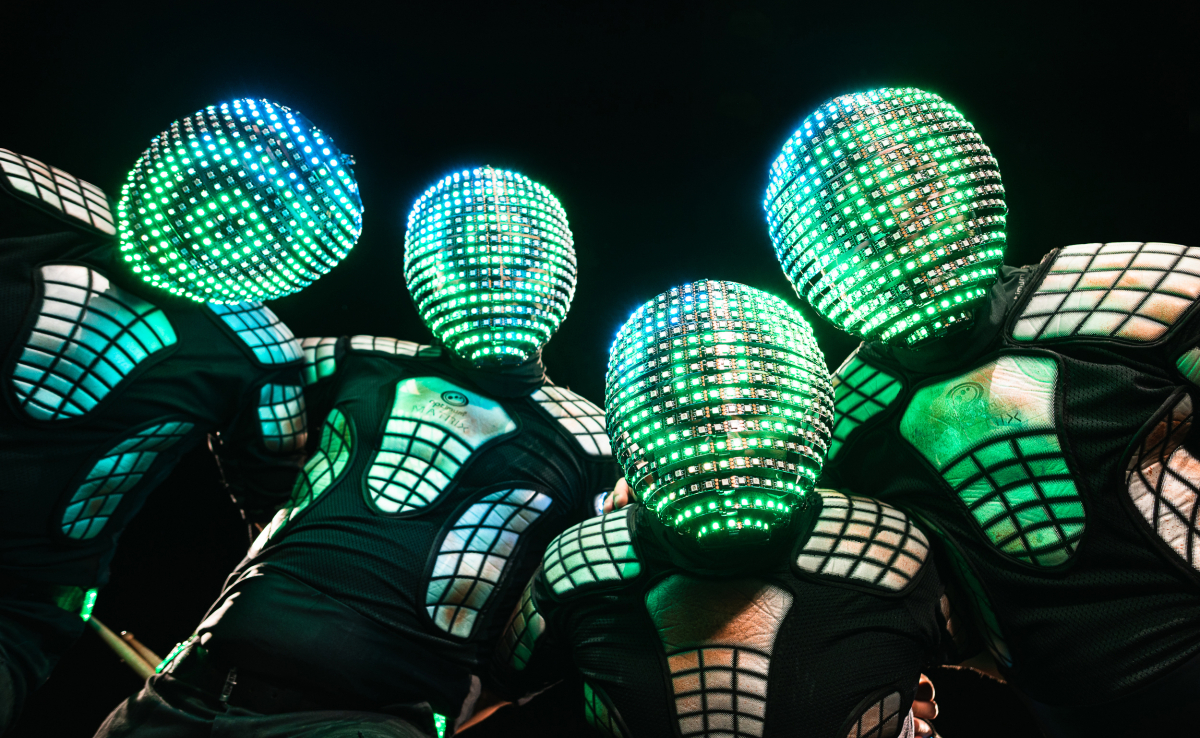 Effets visuels et sonorités inattendues s’entremêlent pour des spectacles de percussions mobiles inédits et insolites.