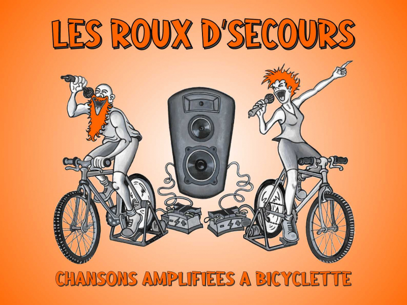 Les Roux d'Secours vous embarquent à bord de leurs bicyclettes produisant l'électricité nécessaire à leur représentation grâce à la force de leurs mollets, et pourquoi pas des vôtres ? !