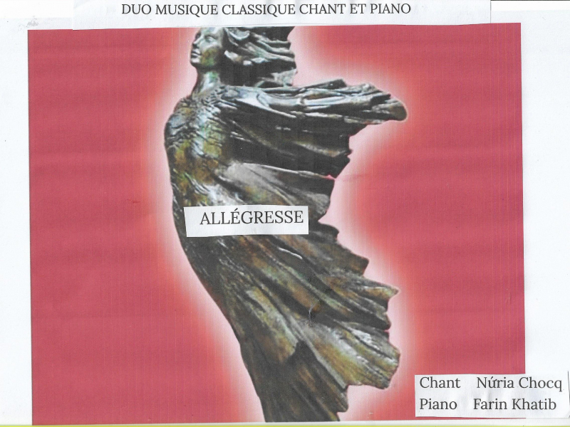 Duo Allégresse vous propose un programme fin,riche et rempli d’émotions avec Nuria Chocq au chant et Farin Khatib au piano. Il vous fait voyager à travers la musique classique, traditionnelle espagnole ainsi que la musique plus actuelle. En espérant que notre proposition retiendra votre attention. Nous vous souhaitons une excellente journée.