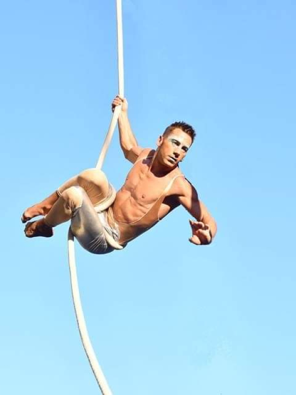 Kevin.n.artist est un artiste de cirque pluridisciplinaire, spécialisé dans les disciplines aériennes, corde lisse, tissu aérien mais également échassier.