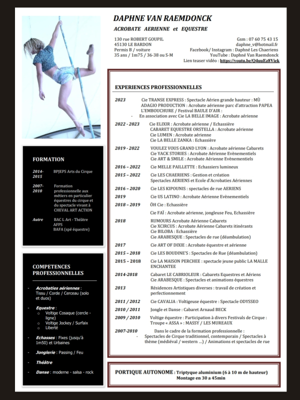Je pratique de nombreuses disciplines tissu/corde/cerceau/grande hauteur... En solo, en duos ou en équipe.
