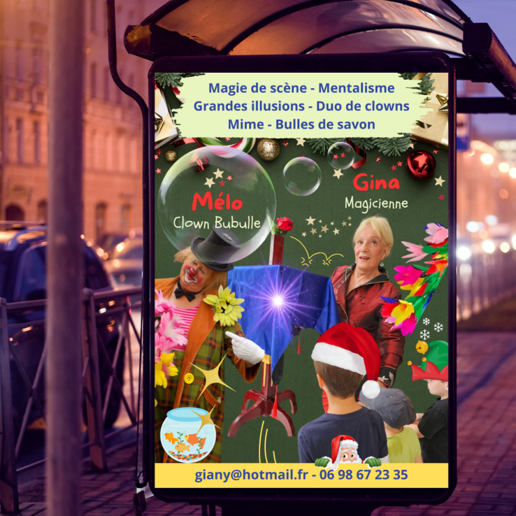 Vous redécouvrirez avec le duo Gina et Mélodie la magie de scène avec des apparitions surprenantes des squetchs de clowns et reverez avec le mime