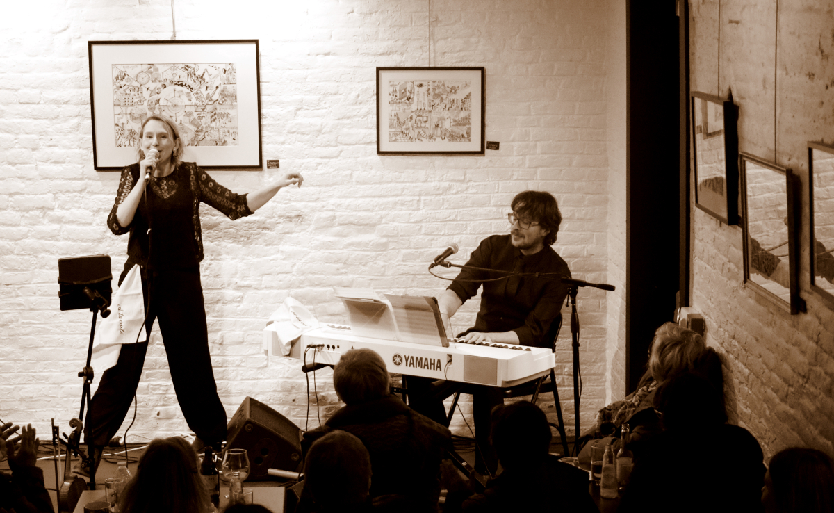 Un menu posé sur les tables. Les recettes musicales d’hier et d’aujourd’hui s’enchainent en fonction des commandes des invités. Les formules mijotent : formule découverte, simple ou encore gourmande… Quelques douceurs mélodiques et pianistiques sont servies sur des poésies cuisinées à la française avec une pincée de tendresse et un zeste d'humour. Genre: concert interactif. Duo pianovoix + violon + stomp box. Musiciens professionnels. Durée: 1h30.