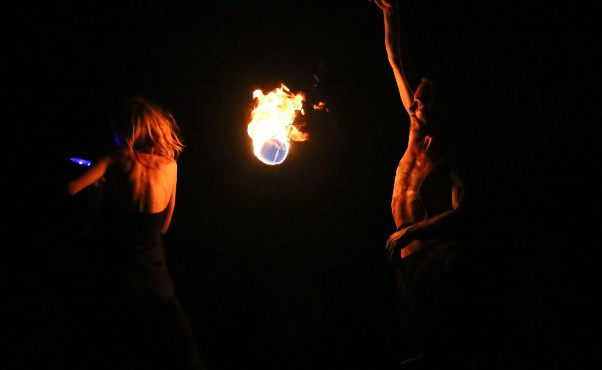 les danseurs sculptent l'espace entre objets enflammés, acrobaties dans des foyers de feu, et lumière lunaire.