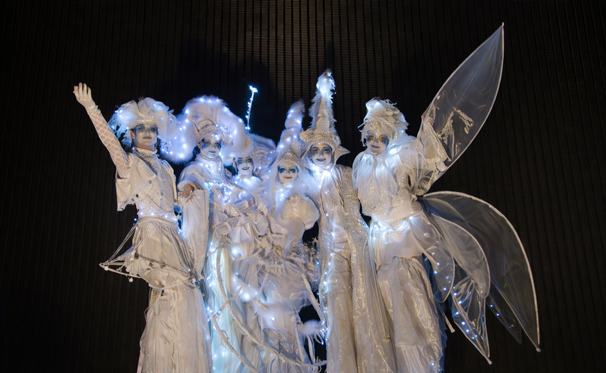 Dès la nuit venue, place à la lumière! Les costumes lumineux intègrent des diodes LED savamment réparties, offrant mille variations chromatiques sans sacrifier la sobriété du blanc originel. Ce mélange subtil fait résonner l’énergie de la fête tout en maintenant une certaine retenue visuelle.