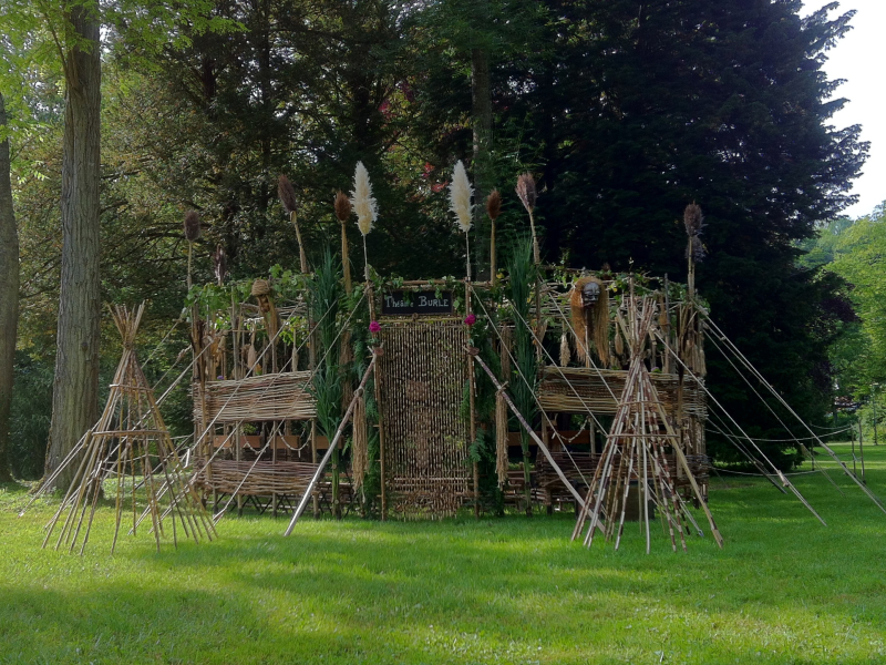 Il en est de même pour la structure délimitant l'espace destiné à accueillir l'aire de jeu et le public : un théâtre végétalisé en forme d'arène, composé de piquets solidarisés par du tressage de bois, vannerie, cordages et végétaux.