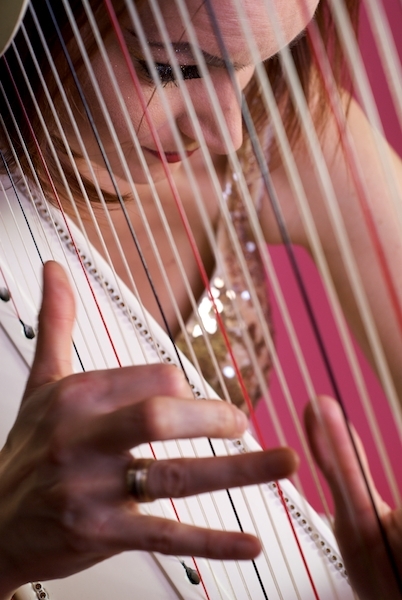 En jouant son répertoire étonnant sur sa harpe toute blanche elle crée des images musicales et lie des anecdotes amusantes aux mélodies.