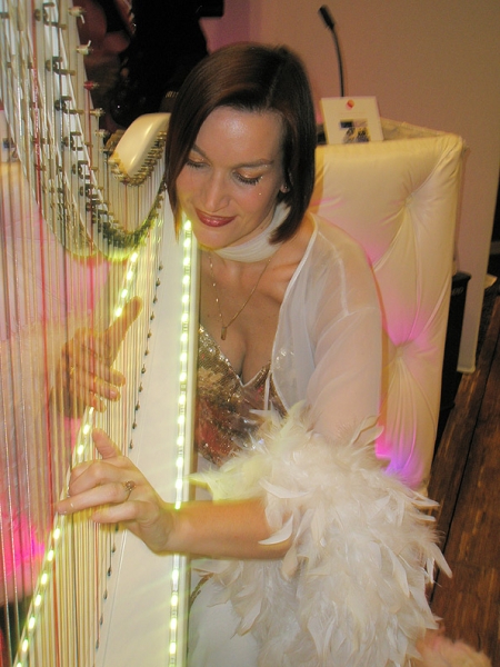 L'éclairage en lumière noire fourni par l' artiste. La harpe est amplifiée par un micro interne.