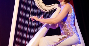 Le numéro peut être joué en lumière 'normale' de scèneou en lumière noire avec des lumières led sur la harpe