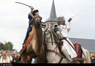 * Les joutes et combats : présentation des blasons des chevaliers, jeux équestres traditionnels (quintaine, bague, écu, javeline, pomme), prise des couleurs auprès des dames du public, joutes à la lance, intrusion de l'écuyer félon, combats à l'épee à cheval, jugement de Dieu (à la hache et fléau)... tout cela sous l'arbitrage d'un maréchal de lice intransigeant !