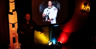 À travers récits, chansons, marionnettes, projection dimages darchives, le conteur chanteur guitariste retrace la véritable épopée dApollo 11.