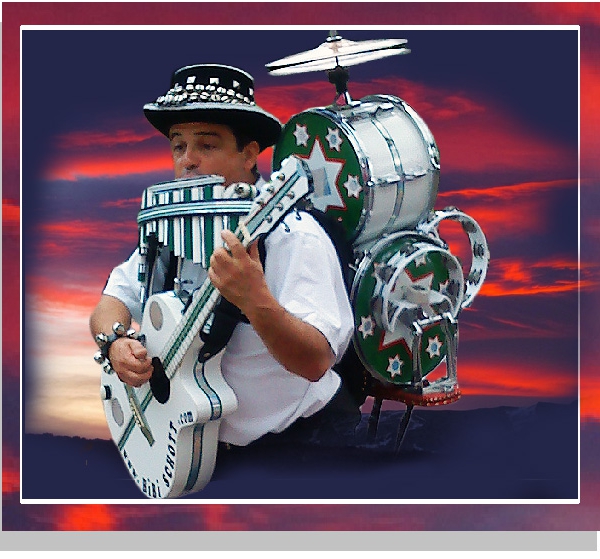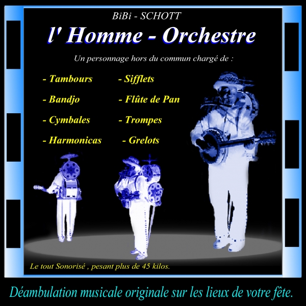 l' homme-orchestre, ce personnage étonnant se déplace sur le lieu de votre fête, chargé d' un lourd matériel, mettant de la joie autour de lui .