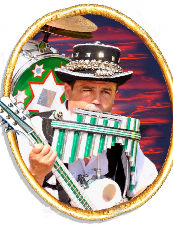 tambours , cymbales , flûte de pan , bandjo , harmonicas , trompes , grelots ,..... cinquante kilos d'instruments de musique jouent des aires de fête , le tout sonorisé .