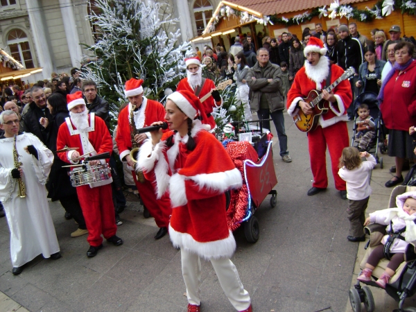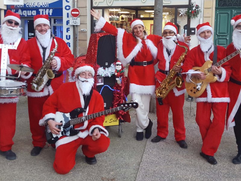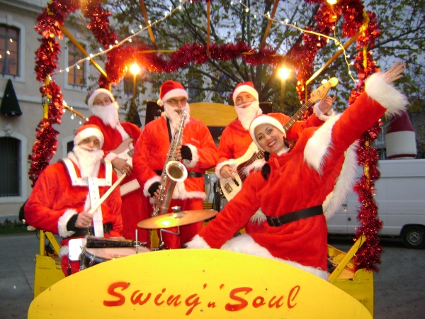 Papa Noël Band : le spectacle de fin d'année incontournable. Les musiciens de l'orchestre Swing'n'soul déguisé en Mama et Papa Noël défilent avec leur traîneau ( qui cache la sono mobile) dans les rue , sur le Marché de Noël , mais ils apportent leur cadeaux musicaux également à bord de la Swingomobile un Dodge des années 40 ,
