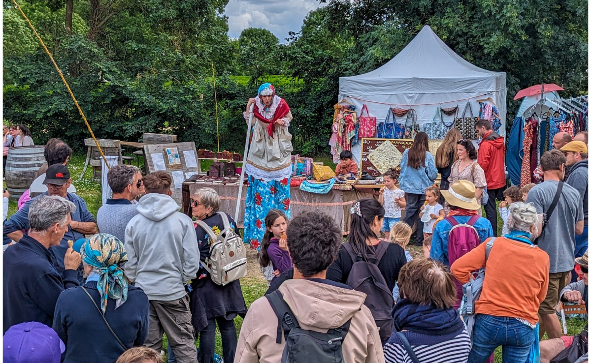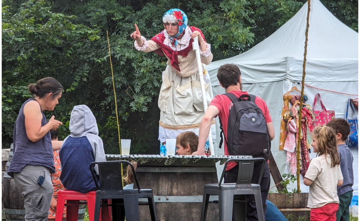 Une échassière marionnettiste et conteuse vient à la rencontre des enfants et leur raconte des contes traditionnels, tel que le petit chaperon rouge, ou encore boucle d’or et les trois ours… elle leur demande de l’aide et les fait participer avec des marionnettes et des éléments de costume.