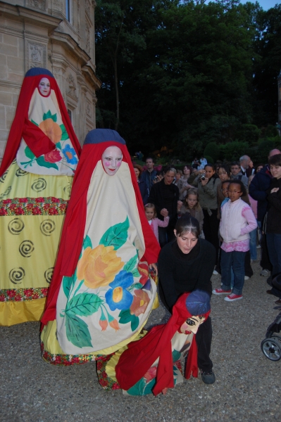 La grande (sur échasses) cache la moyenne (au sol) qui elle dissimule la petite (une marionnette).