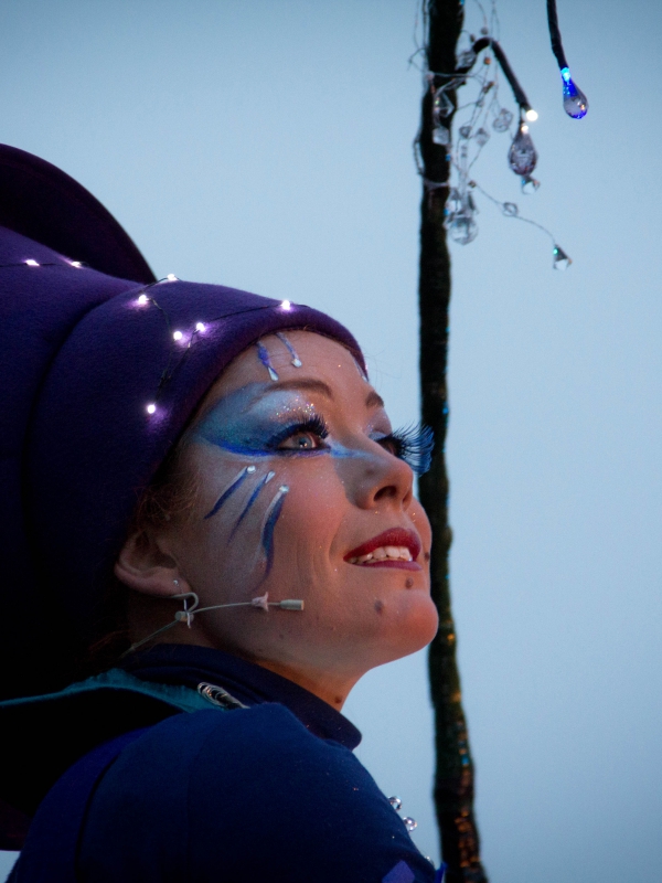 Spectacle son, lumière, pyrotechnie avec décors lumineux, 2 échassières-comédiennes-chanteuses et 1 comédienne au sol. Un spectacle de crépuscule, un hymne à l'espoir