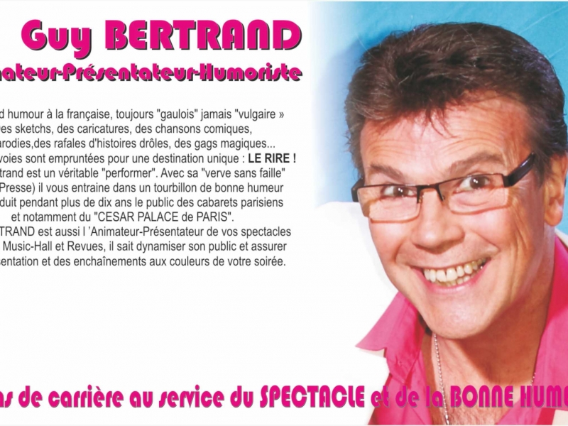 Guy Bertrand est un véritable "performer". Avec sa "verve sans faille" (dixit la Presse) il vous entraine dans un tourbillon de bonne humeur qui a séduit pendant plus de dix ans le public des cabarets parisiens et notamment du "CESAR PALACE de PARIS".