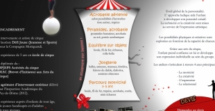 L'encadrement de l'atelier est assuré par des intervenants expérimentés en ce qui concerne le cirque, la sécurité et la pédagogie et s'adresse à tous, quelque soit le niveau (Découverte, débutants, confirmés...).