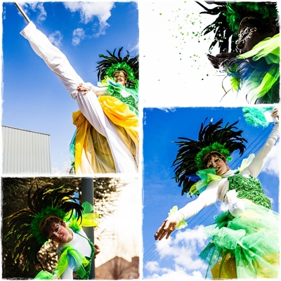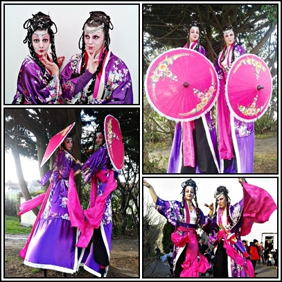 Technique : échasses, danse avec ombrelle et jeux d'acteur