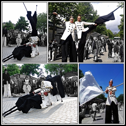 Les échassiers manipulent des drapeaux qu’ils font virevolter avec force et élégance dans les airs. Ils réalisent également des portés acrobatiques.