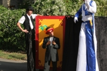 Le concept est simple une grosse boite enferment un magicien tirée par un échassier accompagné par un sculpteur de ballons.