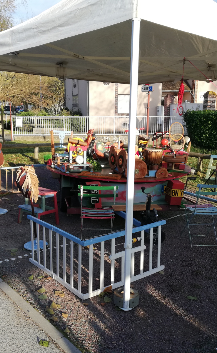 "Le Manège de la récup!" est un petit manège "écologique" , construit en bois avec des matériaux de récupération et des objets détournés.Il fonctionne sans électricité avec la seule énergie des bras... Deux fauteuils équipés de moulinettes permettent aux parents de faire tourner le manège . Une animation conviviale et musicale l' accompagne.