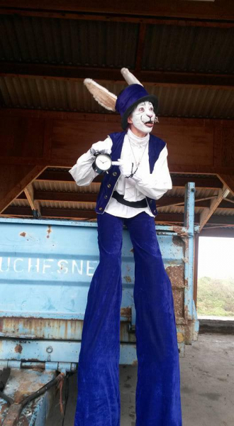 "Z'êtes en retard " hurle le lièvre de Mars bondissant sur échasses pneumatiques ,rattrapé par un lapin complètement farfelu sur échasses lui aussi .