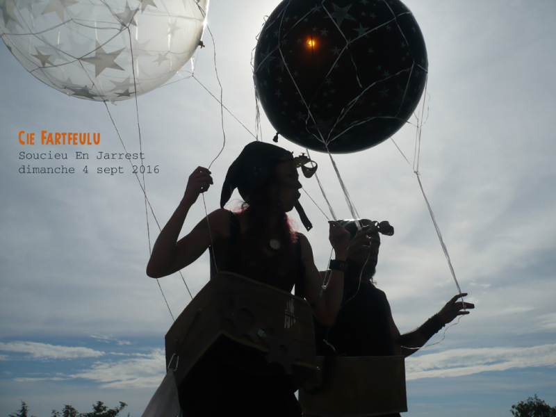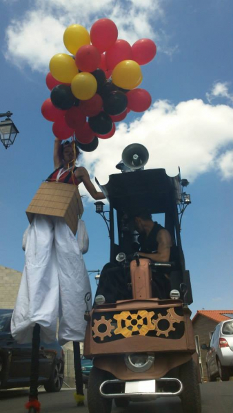 Un spectacle déambulatoire d'inspiration steam-punk burlesque.Un échassier à bord de sa néo-rétro-auto qui diffuse de la fumée parfumée et de la musique festive . Ce char musical passe partout (80 cm de large/ 2 m 50 de haut) accompagnés d'échassières dans des montgolfières .