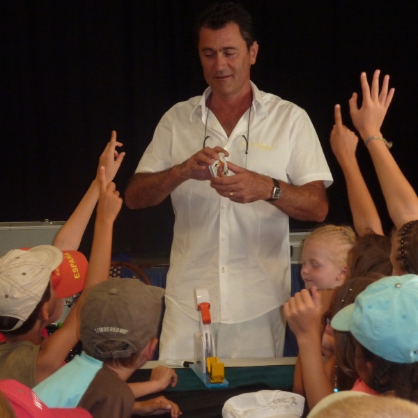 par petits groupes les enfants ou les adultes participent activement à un atelier pédagogique avec pour thème l'initiation et l'apprentissage de tours de magie.