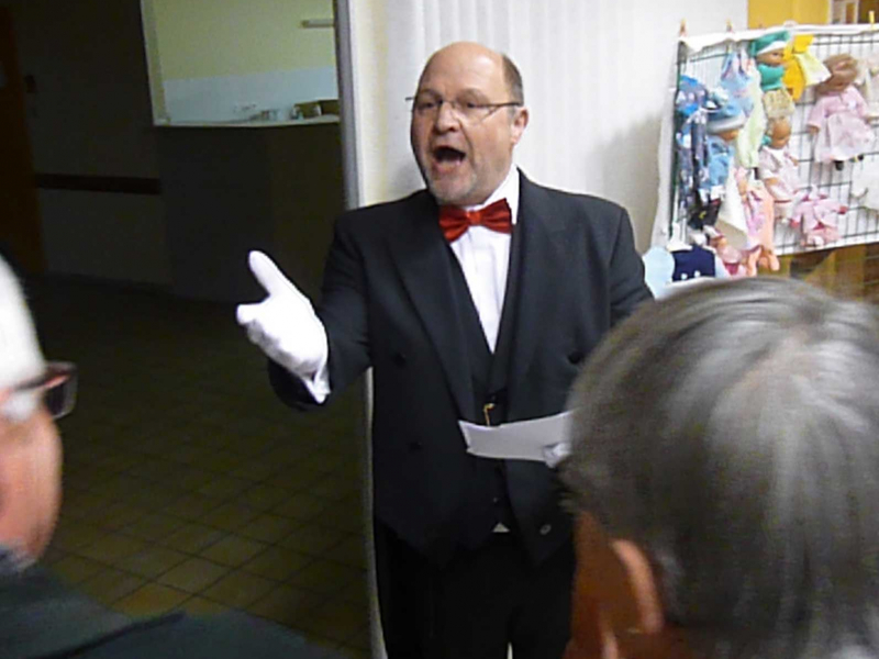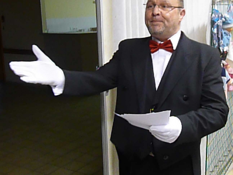 En costume belle époque ou smoking il annonce l'arrivée des invités de façon humoristique, à pleine voix ou officiellement.