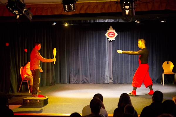 Néammoins, il sera rapidement contraint de faire appel à des bonnes âmes parmi le public pour pourvoir les postes qu'il occupe d'habitude (lancer la musique, régler la lumière, voltiger, envoyer des balles, et même jongler...)