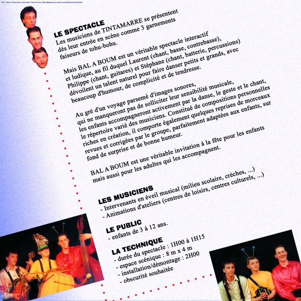 au fil duquel les enfants dansent, miment et chantent. Les artistes de Tintamarre se transforment en véritables garnements, et nous dévoilent leur talent naturel grâce à leur humour et leur convivialité, pour emmener petits et grands pour un grand tourbillon de rires, de fête et de bonheur.