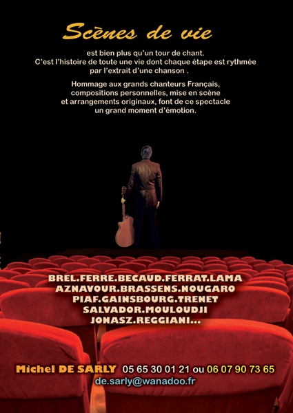 Voici Scènes de vie à travers la chanson française (chansons à texte). Un spectacle d'1H30, avec Michel De SARLY : Chant et guitare et arrangements musicaux autour des grands noms de la chanson Française BREL FERRE BECAUD FERRAT LAMA AZNAVOUR BRASSENS NOUGARO GAINSBOURG PIAF TRENET SALVADOR MOULOUDJI JONASZ REGIANI....