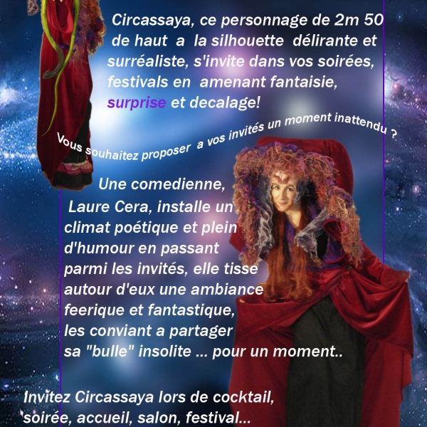 Circassaya, personnage de 2M50 de haut,à la silhouette délirante et surréaliste,s'invite dans vos soirées et évènements en amenant fantaisie,surprise et décalages.