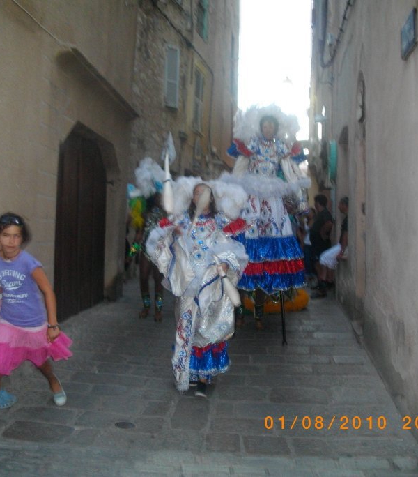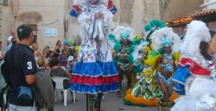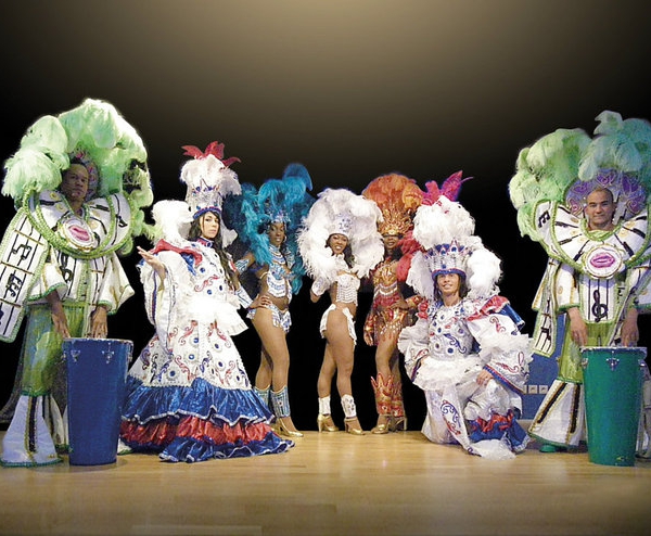 déambulatoire brésilienne composé de 4 musiciens et de 2 échassiers.2 a 20 danseuses