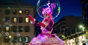 Au cœur de cette féérie, un char avance lentement, diffusant une mélodie envoûtante, tandis qu'une pluie de bulles géantes, nées des mains des échassiers, s'élève et éclate en reflets éphémères. Chaque bulle semble contenir un rêve, chaque pas est une danse légère, une chorégraphie aérienne qui enchante le public.