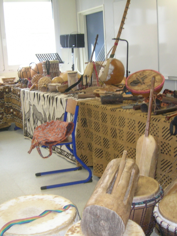Présentation et jeu de différents instruments de percussion et mélodiques: djembé, kamele n'goni, donso n'goni, djeli goni, kora, sanza et balafon. ( goni > instrument à corde)