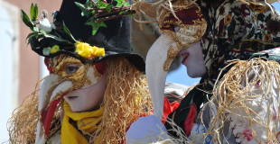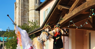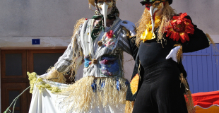 Animation déambulatoire de deux échassiers, Polichinaï et Polichinette.