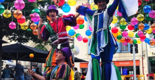 Parade sonorisée composée de 4 échassiers, 1 tricycle musical, 3 jongleurs au sol.
