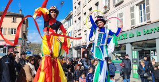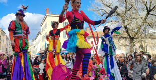 La parade "Les Saltimbanques", est un véritable festival de couleurs, de joie et d'énergie qui envahit les rues lors de fêtes, carnavals et évènements festifs. Les échassiers, vêtus de costumes éclatants et extravagants, sont de véritables maitre de la danse. Leurs costumes sont un tourbillon de tissus vifs, avec des foulards dansants à chaque mouvement, de beaux chapeaux colorés de fleurs et des maquillages festifs. Chaque échassier est une explosion de vitalité et de bonne humeur, transformant chaque passage en un spectacle vivant.