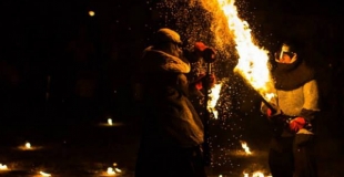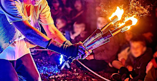 Yule : Spectacle feu et pyrotechnie Lorsque s'allument les lanternes, les tambours retentissent dans la nuit noire... Entrez dans un rituel de magie ancestrale, une lutte de pouvoir entre sorciers et sorcière, un passage vers le monde... Par Faces & Fire Cie