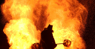Cyber : Spectacle feu et pyrotechnie "Eclairés à la lumière des néons, dans un paysage qui semble abandonné, trois êtres explorent peu à peu ce nouveau terrain de jeu, embrasant des objets, mêlant les corps avec les flammes :... Par Faces & Fire Cie