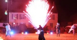 Ce spectacle mêle feu, chant sur échasses, musique, danses et escrime. Vous y trouverez également des artifices de proximité, de la danse suspendue et des enluminures lumineuses sur les murs.
