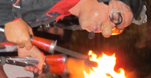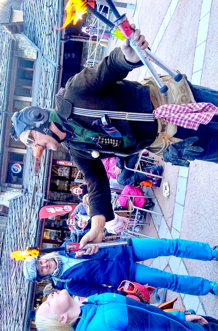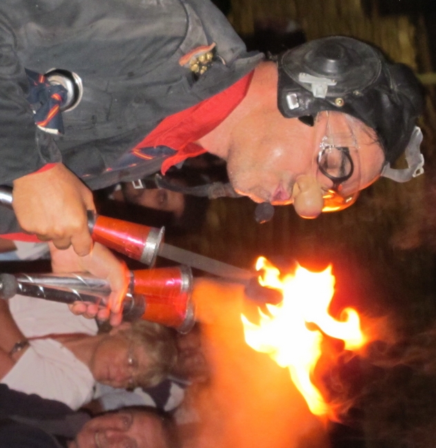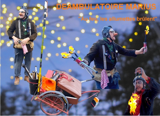 Marius est le cousin enflammé de Boulon,du jonglage avec torches, de l'équilibre, des artifices de proximité, un personnage loufoque et burlesque, des balles lumineuses, une danse permanente sur une musique Italienne, des exploits, de la frime, attention le feu ça brûle...