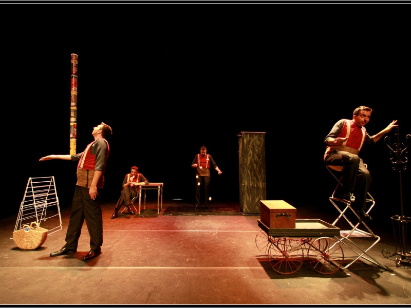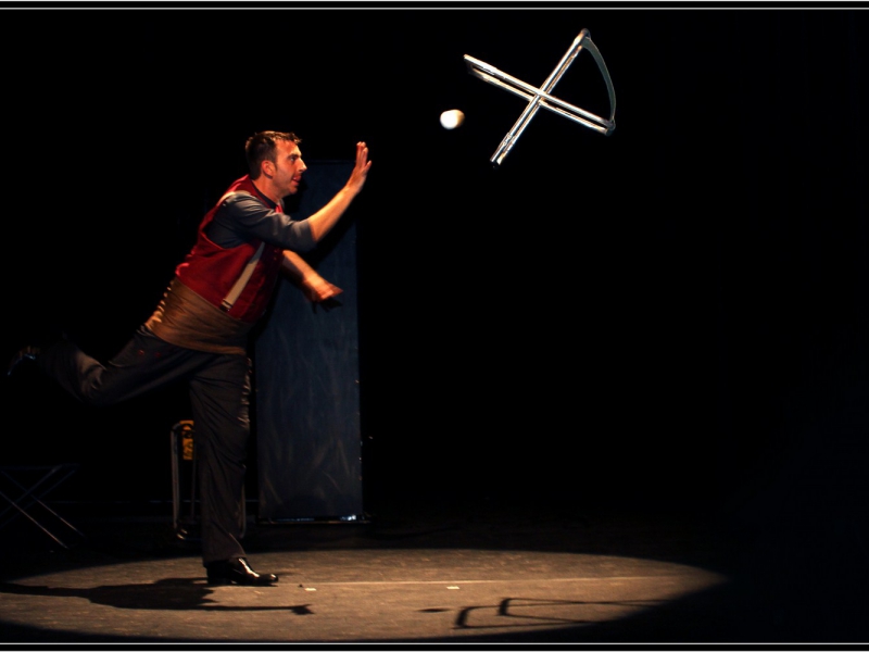 Solo de cirque burlesque dans l’esprit de Jacques Tati, jonglerie et la manipulation d’objets du quotidien détournés de leur fonction première pour créer un univers décalé et poétique.