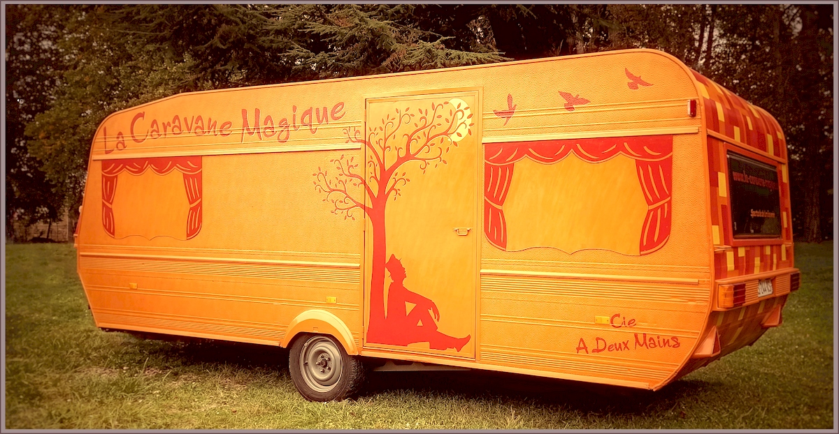 La Caravane Magique, c'est une caravane aménagée en petite salle de spectacle, avec sa scène, ses gradins et son parterre...