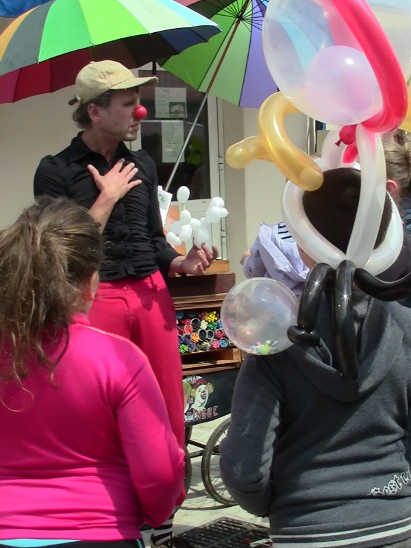 Nos clowns débarquent avec leur étrange chariot roulant qui semble venir du passé, ils vous embarquent alors pour un voyage dans l'univers du ballon sculpté avec de nombreux modèles : de l'incontournable caniche à des créations uniques et sur mesure, démesurées et festives, aux couleurs de vos visiteurs.