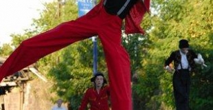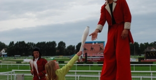 Umberto et Mr Guigaro déambulent du haut de leurs échasses au milieu des spectateurs surpris et impressionnés. Au sol, Sacha, loyal et naïf serviteur, ouvre le chemin du spectacle.