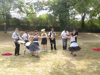 Laurent à la clarinette, Grégoire au saxophone alto, Dominique à la trompette, Aurélie au tube, Marielle au saxophone baryton, Stéphane à la grosse caisse, Emmanuel à la caisse claire